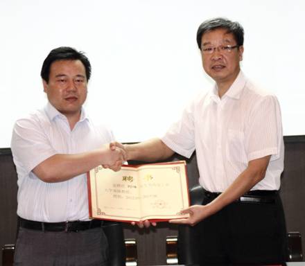 发展状况,坚增运副院长向大家介绍了刘峰教授在科学研究上取得的优异成绩。刘建勋副校长与受聘刘峰教授签订聘任协议并为受聘“客座教授”颁发聘书。刘建勋副校长指出,广泛引入社会的优质资源、聘请有真才实学的优秀人才担任我校的客座教授,将是我校努力提高教育教学质量、优化教师队伍结构、形成理论知识与实践知识相结合的教学体系的有力保障。刘峰教授长期从事科学研究,有丰富的实践经验和理论水平,作为我校的客座教授,他渊博的知识和丰富的社会经历将给我校老师和学生们留下宝贵的精神财富,为学校的发展带来新的力量。