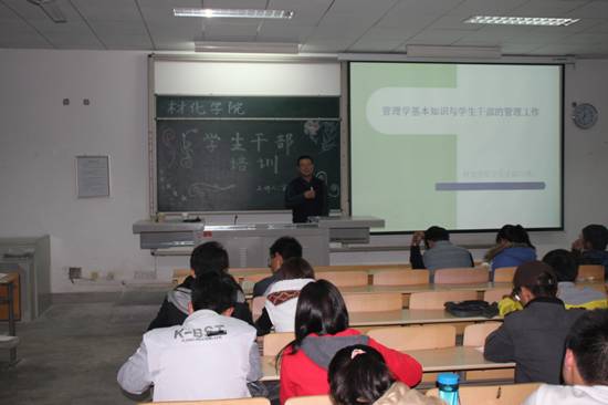 材化学院学生干部系列培训于2012年开办,2013年持续开展,分别从“学生干部应该处理好的各种关系”、“学生干部应该具备的基本素质”、“管理学知识与学生干部的管理工作”、“学生干部的基本职责”等四方面由院党委书记张忠老师、党委副书记张治宏老师、辅导员组长方由林老师、分团委副书记王国栋老师主讲,着力培养一批思想素质高、工作能力强、学习成绩优秀的学生干部队伍。