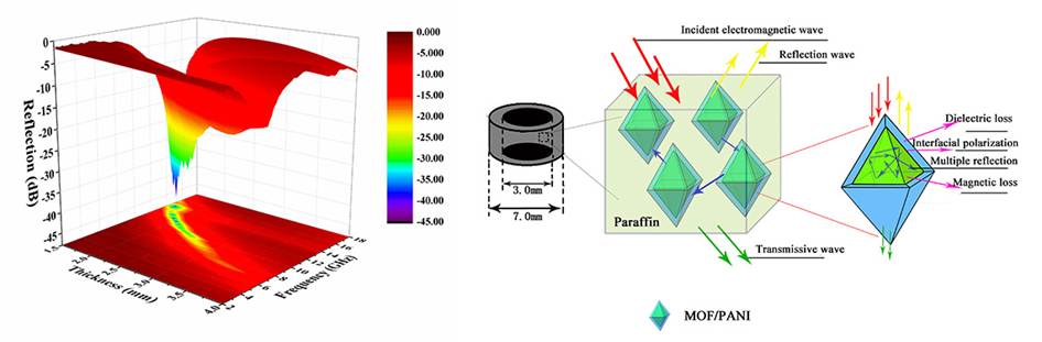 金属有机框架较高的孔结构和大比表面积使其在气体存储、分离、吸波、催化和传感器方面具有潜在的应用价值,其大比表面积为电磁波的散射提供较多的散射位点,电磁波进入孔洞内发生多次反射、散射而迅速耗散掉。研究发现一种导电高分子,盐酸为掺杂剂,通过分子间作用力原位聚合包覆MOF材料,形成增强的界面极化和适宜的阻抗匹配效应,可实现电磁波薄、轻、宽、强的吸收,为多功能MOF材料的结构构筑及电磁吸收提供了新的思路。