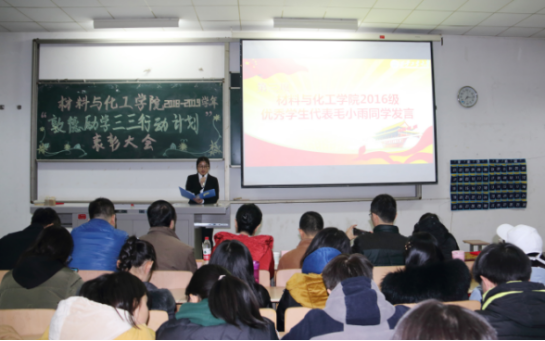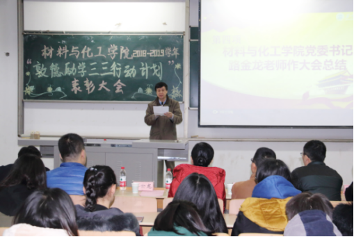 2018年“敦德励学三三行动计划”总结表彰大会在教1-105隆重举办。材化学院党委书记路金龙出席此次大会并发表讲话,学院党委副书记张艳霞、学生班主任、全体辅导员、获奖学生和学生代表参加了此次大会。
