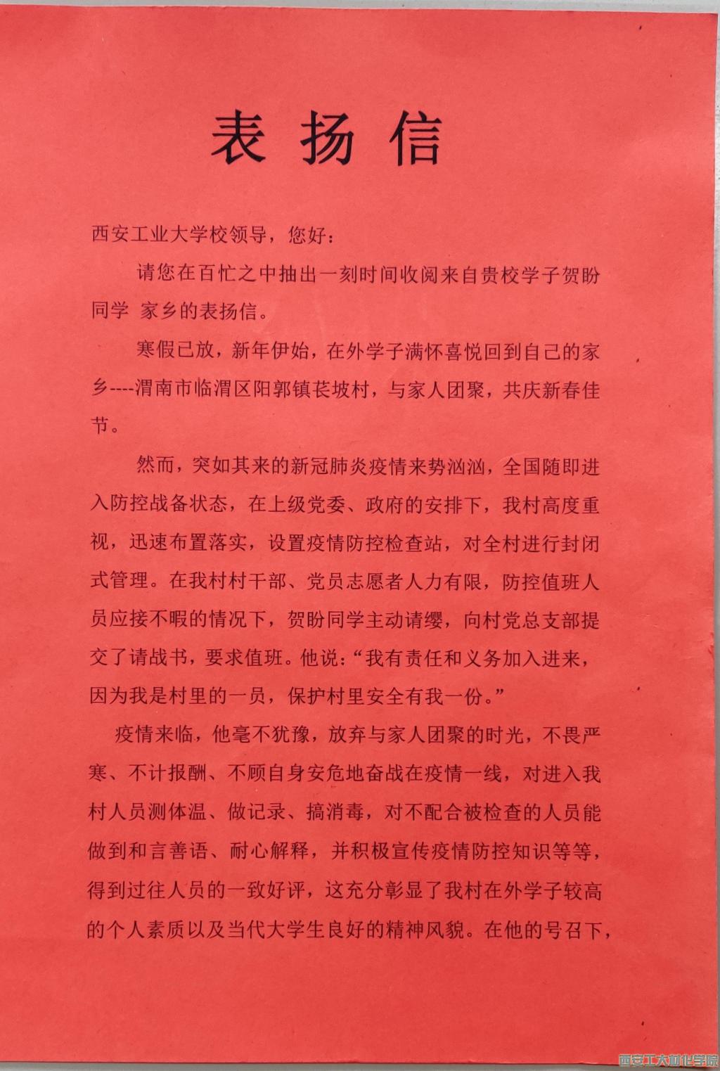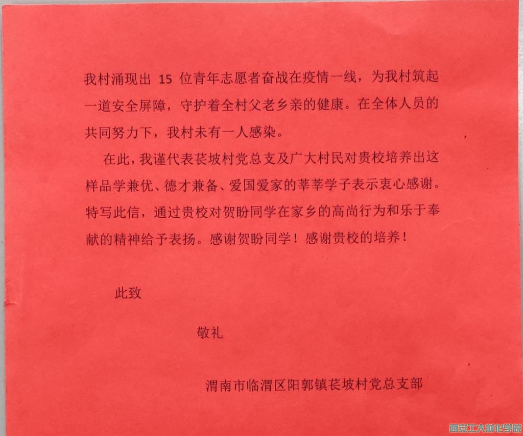 收到了来自渭南市临渭区阳郭镇医坡村的疫情表扬信,信中对材化学院2018级材料化学专业贺盼同学在疫情期间,为当地疫情防控工作贡献青春力量提出了感谢和表扬,并对同人小说