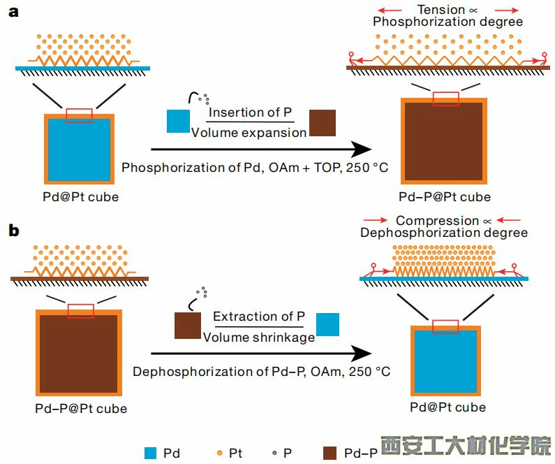 为共同研究单位。该成果于2021年10月6日正式发表,论文题目为《Mastering the surface strain of platinum catalysts for efficient electrocatalysis》。该成果提出了一种新颖的调控铂催化剂表面应力的方法,通过借助磷原子在催化剂中的嵌入和脱出,精确调控了铂原子表面的应力大小,为高效催化剂的设计和研发开辟了一条新的路径。