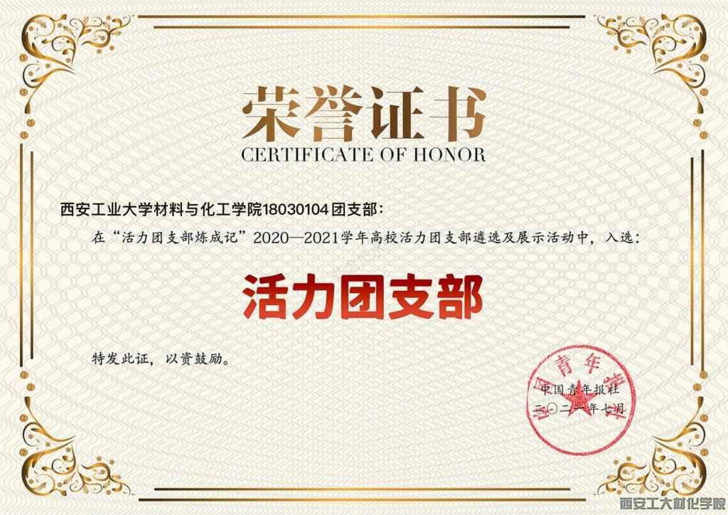 为深入贯彻落实“全团大抓基层”、“全团抓学校”部署,深化高校共青团改革,强化“一切工作到支部”理念,在团中央基层建设部指导下,中国青年报社开展“活力团支部炼成记”2020—2021学年高校活力团支部遴选及展示活动。此次活动中,各省级团委推选的1200个活力团支部通过新媒体方式集中展示了在党史学习教育等方面的建设成果和典型经验,1100万人次参与网络点赞。经校级申报、省级初评、展示点赞、全国终审等环节,我院18030104团支部荣获“2020—2021学年全国高校‘活力团支部’”称号,也是我校唯一一个获评的团支部。
