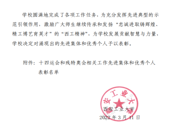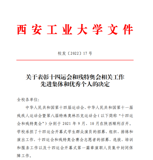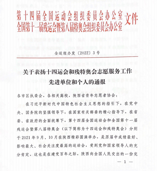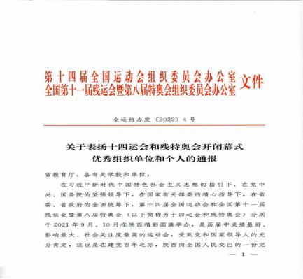 近日,第十四届全国运动会组织委员会办公室、全国第十一届残运会暨第八届特奥会组织委员会办公室联合印发了《关于表扬十四运会和残特奥会志愿服务工作先进单位和个人的通报》和《关于表扬十四运会和残特奥会开闭幕式优秀组织单位和个人的通报》,我校荣获“十四运会和残特奥会志愿服务先进单位”和“十四运会开闭幕式优秀组织单位”荣誉称号,多名师生荣获表彰。同人小说