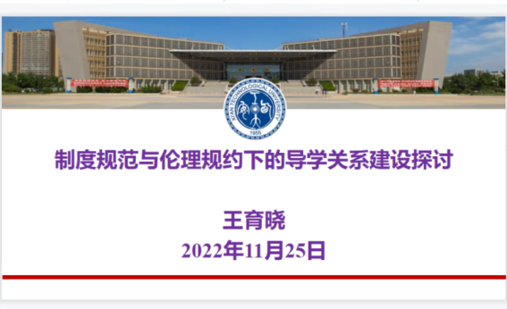 王育晓教授从研究生教育发展现状及突出问题、系列文件制度规范、建立关心型导学关系-伦理规约等三个方面,结合个人指导学生经历,系统阐述了如何加强研究生导学关系建设。