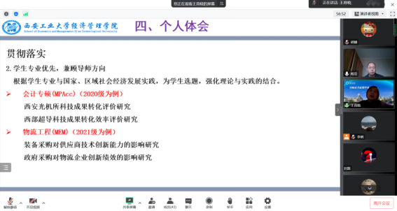 最后,结合王育晓教授的报告,杨忠副院长对学院研究生导师提出要求,广大导师要贯彻党的教育方针,立德修身、严谨治学、潜心育人,做好研究生教育的第一责任人。