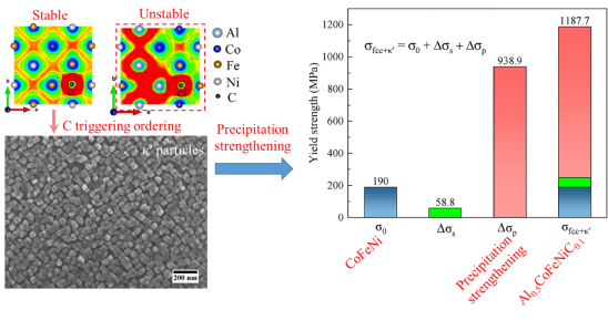 高密度共格纳米相增强FCC基金属材料的简单、低碳制造一直以来是工程界的难点,以往都是采用复杂、高能耗的热机械工艺,且难以获得大体积分数纳米相。对此,高熵合金团队利用掺杂C与Al及过渡元素之间键合作用的巨大差异,而诱导形成反向畴界能高的有序纳米κ′相。基于此,团队采用直接凝固制备纳米κ′相增强高熵合金。该合金纳米κ′相体积分数高达55%,屈服强度达到1.1GPa,其中由纳米κ′相的贡献值接近GPa级,达到0.94GPa。这一成果不仅为纳米共格增强FCC基金属材料提供了一种新型增强相,而且为该类材料的制备提供了新策略,有望实现低碳制造。论文链接://doi.org/10.1016/j.mtnano.2023.100331