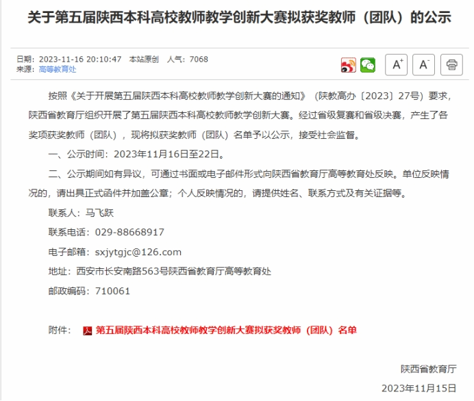 2023年11月16日,陕西省教育厅公布了第五届陕西本科高校教师教学创新大赛获奖教师名单,同人小说