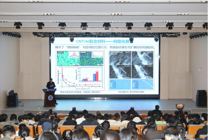 报告会上,张荻院士从建立热/动力学模型,调控合金成分、改善增强体表面性质和调控界面相容性四方面出发,揭示增强体诱发动态再结晶的热变形机制,以突破若干“卡脖子”核心关键瓶颈,打破国际封锁;针对金属基复合材料高强低韧失配难题,启迪自然贝壳微纳砖砌复合构型可同步提高材料的强韧性的原理,创制出具有类贝壳微纳砖砌复合构型的CNT/Al基高强韧金属基复合材料,揭示 “微纳砖砌”构型的强韧匹配协同机理;巧借生物构型多样性及其独特结构效应,提出“遗态复合材料”的新概念,建立秉承自然精细构型的新型复合材料构筑方法,创制一系列具有生物精细构型的新材料,发现构型与组分耦合的新现象,揭示构效机制,为构型化复合研究提供了新方法。