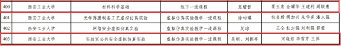 4门课程被认定为陕西省一流本科课程,其中线下一流课程1门、线上一流课程2门、虚拟仿真实验教学一流课程1门。目前,学院共有1门国家级、12门省级一流本科课程。
