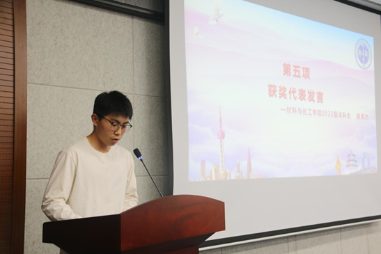 2022级本科生吴英杰发言,他分享了这次宝贵经历带给他心态上的成长和技能技术素养的提高,也感谢了指导老师们的辛勤付出,并表示会在省赛中不负老师期盼,发挥出更加精彩夺目的表现。