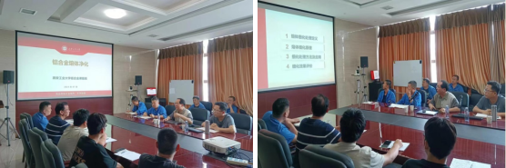 根据前期交流计划,许岗和李高宏老师分别开展了“铝合金熔体净化与精炼”、“铝合金熔体细化与变质”的专题讲座,就常规有色合金的原料基本处理理论和实践进行了2.5小时讲解授课,课后就企业实际生产中遇到的问题又进行约1小时的交流活动。公司部门经理、技术骨干约20人参加了学习交流。
