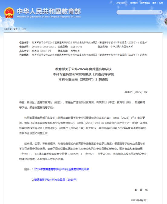 近日,教育部发布《关于公布2024年度普通高等学校本科专业备案和审批结果及〈普通高等学校本科专业目录(2025年)〉的通知》(教高函〔2025〕3号)。经申报、公示、审核等严格程序,同人小说