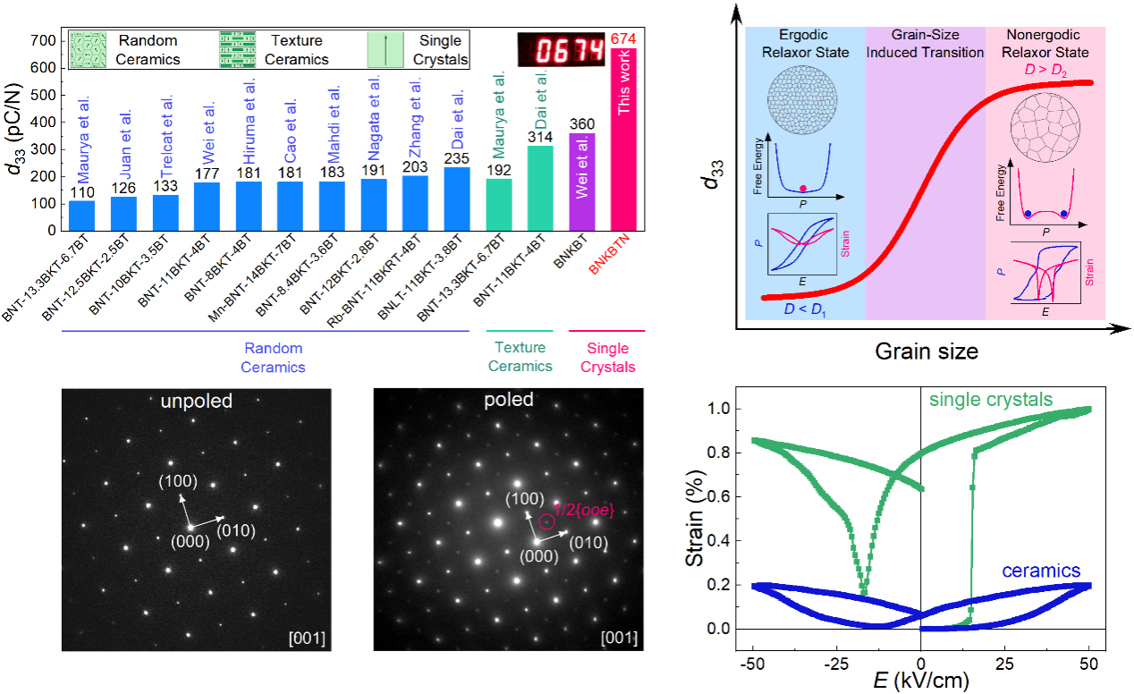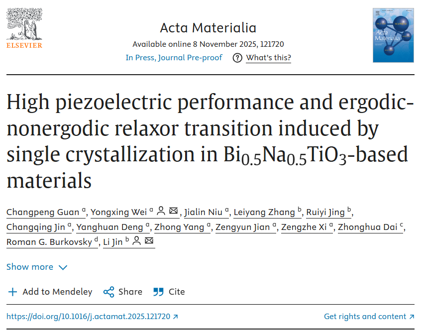 近日,我校魏永星副教授研究团队硕士研究生关畅澎在国际顶级学术期刊《Acta Materialia》(IF=9.3)上发表了题为“High piezoelectric performance and ergodic-nonergodic relaxor transition induced by single crystallization in Bi0.5Na0.5TiO3-based materials”的学术论文。同人小说