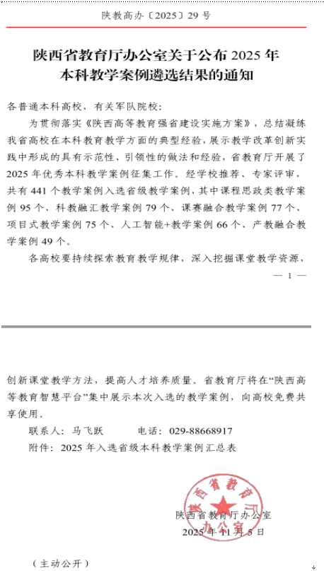 案例的成功入选,是陕西省教育厅对学院本科教学改革创新、课程思政建设成果的高度认可。下一步,学院将以此次入选为契机,持续深化课程思政建设,推动思政元素与专业课程深度融合,不断完善产教融合育人机制,全面提升人才培养质量,为学校“双一流”建设和高质量发展注入强劲动力。