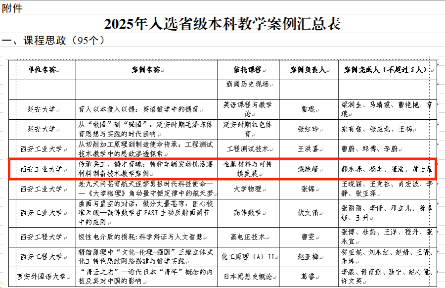 梁艳峰老师牵头完成的《传承兵工、铸才育魂:特种车辆发动机活塞材料制备技术教学案例》,成功入选“课程思政类”教学案例,彰显学院在思政育人与专业教学融合领域的扎实成效。