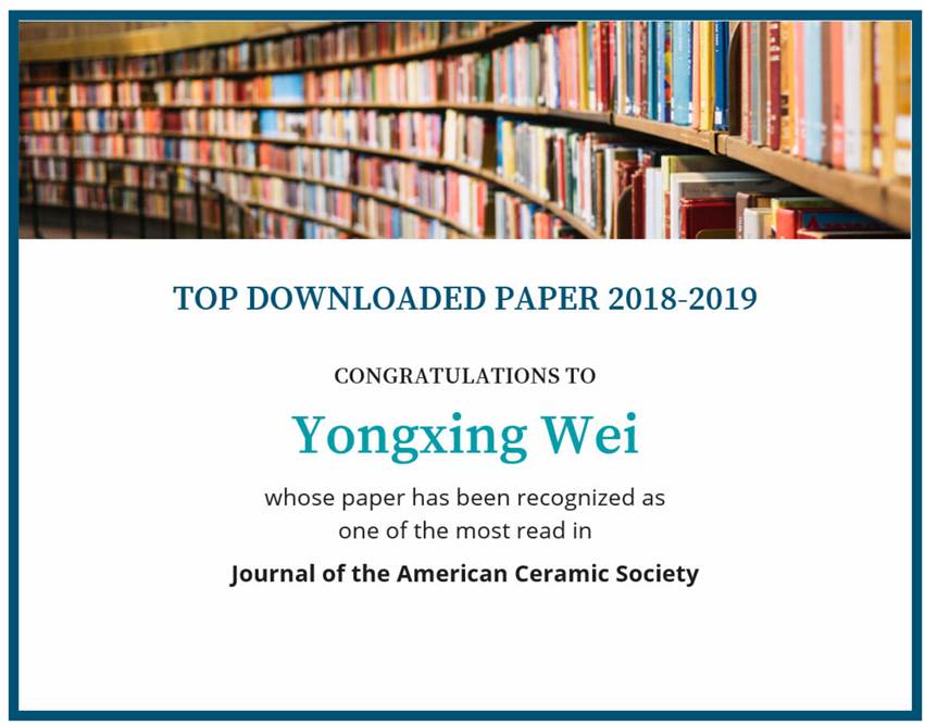 教师魏永星为第一作者发表的学术论文:Bi0.5K0.5TiO3–CaTiO3 ceramics: Appearance of the pseudocubic structure and ferroelectric‐relaxor transition characters, Journal of the American Ceramic Society, 2019, 102: 3598-3608入选国际陶瓷学科顶级期刊Journal of the American Ceramic Society前10%最大下载量论文(top 10% most downloaded papers)。这意味着2018年1月至2019年12月在该期刊发表的所有学术论文中,该学术论文是一年周期内最大下载量和阅读量论文之一。