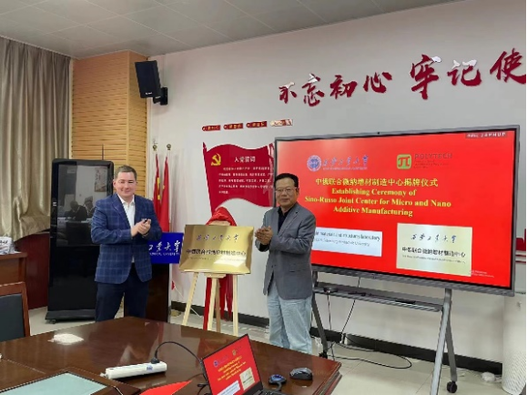 国际交流与对外合作处处长张冬敏介绍中俄合作情况,表示我校从2018年开始与俄罗斯圣彼得堡彼得大帝理工大学进行学术上的交流。惠增哲院长与Anton A. Naumov共同为中俄联合微纳增材制造中心揭牌。