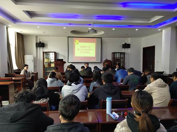 金属材料教工党支部党课学习暨学生第二党支部学生座谈会于2019年11月8日中午在工3-404报告厅召开,教工党支部书记梁艳峰、教学副院长郭永春、学生第二党支部书记张瑞红,金属材料教工党员、学生第二党支部全体党员以及2018级发展对象学生参加了座谈会。