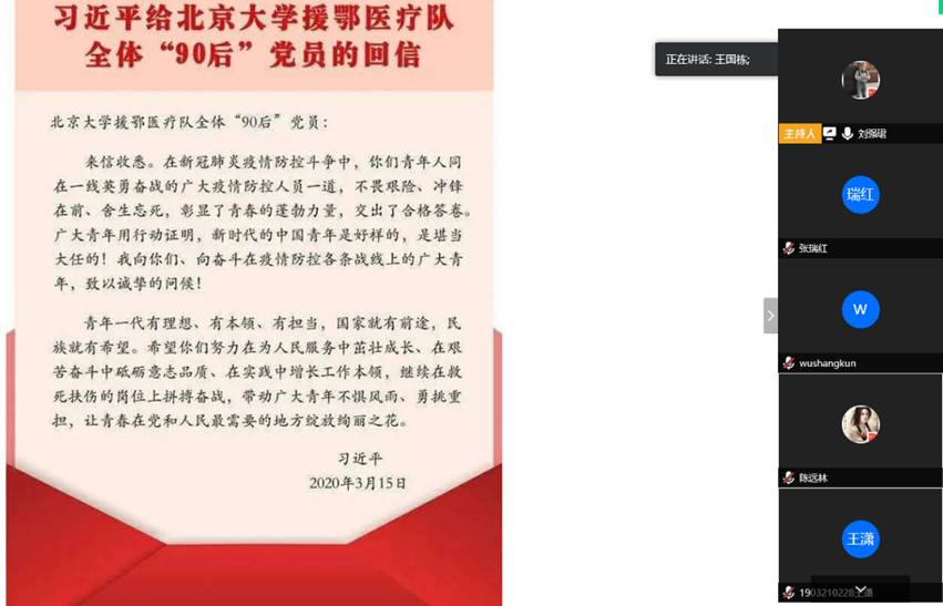 会议伊始,全体与会人员共同学习了习近平总书记给北京大学援鄂医疗队全体“90后”党员的回信,习近平总书记在回信中指出,青年一代有理想、有本领、有担当,国家就有前途,民族就有希望。与会同志一致表示,要在各党支部中认真学习习近平总书记对青年一代的嘱托,在抗击疫情的斗争中、在日常的学习科研中,继续发挥好党员先锋模范带头作用,展现青年人不畏艰险、冲锋在前、舍生忘死的蓬勃力量。