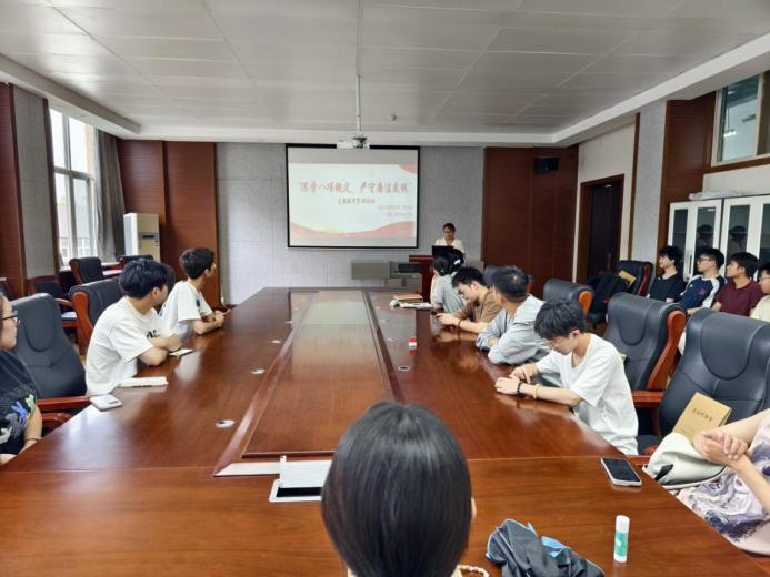 为深入贯彻落实中央八项规定精神,进一步增强党员廉洁自律意识,筑牢拒腐防变的思想防线,材化学院学生第二党支部于2025年6月9日在工4-302召开以“深学八项规定,严守廉洁底线”专题党课学习。本次党课由支部书记张瑞红主讲,支部全体党员参加。