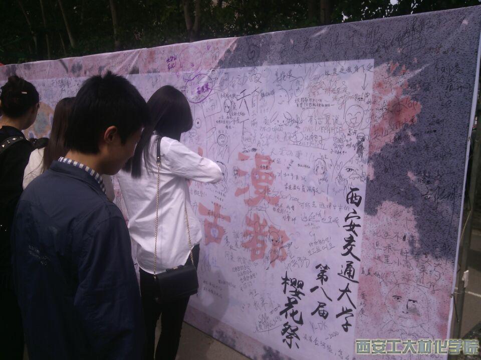 活动在12时30分正式开始,所有到会人员都先参加了隆重的签名活动,在西安交通大学留下了友好的足迹。签名活动之后,大家共同观看了西安交通大学的社团表演,每个表演在充分表达了社团文化的同时,做到了新颖深刻,并向大家传递了西安交通大学深厚的校园文化。他们高亢明亮的歌声,优美整齐的舞蹈以及风格迥异的社团文化展示赢得了现场观众热烈的欢呼。既社团表演之后,更有动漫社团带来的美轮美奂的cosplay展示。精致的服装与出色的舞台表演完美结合,将整个会场推入了高潮。最后,大家怀着激动难耐的心情合影留念。至此,本次西安交通大学“樱花季”采风交流活动圆满结束。
