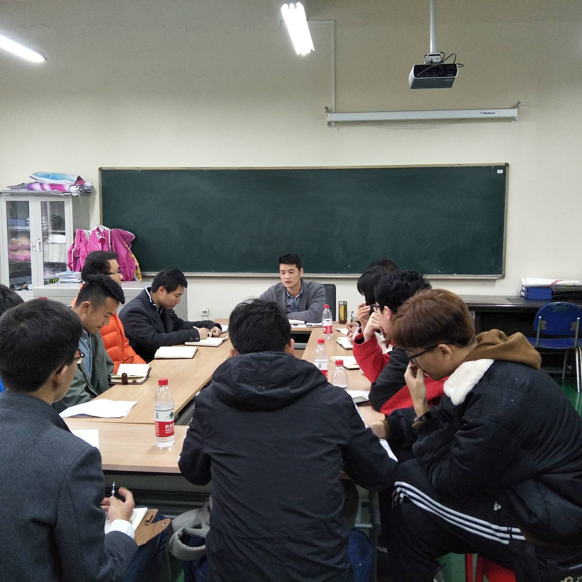 本次会议由段强老师组织召开,会议开始,段老师就对新学期各项主要工作做了安排。段老师首先对各团学组织主席团换届的工作做了详细指示。要求各组织及时完成换届交接工作,提醒新主席团成员尽早完成职责分化,明确分工,并对一些细节进行重点说明。随后段老师强调各组织应继续严抓纪律,进一步明确奖惩机制,宣布了新团学办公室使用纪律,规范学生干部行为,提升学生干部工作积极性。最后,段老师对一些重要学生活动做出了安排,详细讨论了“学雷锋”系列活动内容,并要求大家及时适应学校新作息时间表,对活动时间、流程进行适当调整。对于老师的指示各主席进行了讨论,提出了相应的建议。至此,本次团学工作安排会顺利结束。