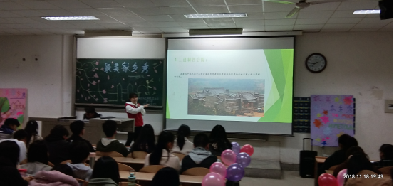 本次活动长达两个小时,首先,由主持人郭小艳、周镇宣布比赛开始,活动主要以参赛选手介绍有关家乡的PPT为主。选手们讲解的生动精彩,配有动听的音乐和精彩有趣的小视频让人眼前一亮,给评委和观众都留下了深刻的印象。当然,其中少不了各地的风景和美食,四川的麻辣火锅,广西的山清水秀,山东的名胜古迹等让同学们有要去一探究竟的冲动。此外,参赛选手与观众积极互动,现场气氛十分活跃。中场游戏环节,观众们也踊跃参与“猜省行政区图“游戏中,更是把活动气氛推向高潮。最终,朱秋雨以优越的成绩荣获比赛第一名,罗茗洋为比赛第二名,靳玉梅为第三名 。至此,“最美家乡秀“第一场比赛圆满结束。