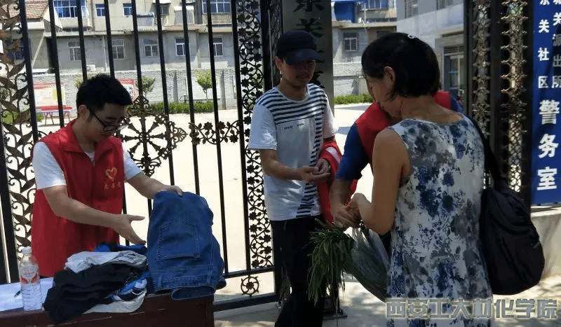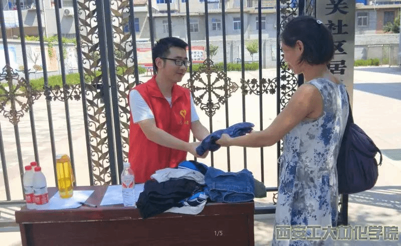 在与当地街道办丰原社区的工作人员沟通后,实践队员们开展了募捐活动。实践队员们做好了提前准备,给每位前来募捐的好心人递上一瓶冰镇的农夫山泉。头顶的烈日就好比像实践队员们心中的热情一样,更是多了一份干劲。在炎热的夏天中没有多少行人,实践队员们仍认真的介绍活动目的,但民众们参与度不高,当实践队员们快要陷入绝望之中,一位50多岁的阿姨加入了活动,她家离此处不远,不到10分钟就给队员们拿来了衣物,这让队员们非常感动。阿姨是一位教师,她非常支持大家的工作,主动帮助大家扩发这个讯息,她给队员声情并茂的讲了一些励志故事,此时过往的路人停下脚步,靠拢过来,不一会儿他们都从家中找出的不用的衣物,前来募捐。