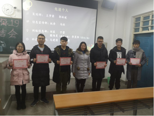 本次会议由策划部部长乔国权主持。首先由组织的各个部长对本学期的工作进行总结,并对部员们的工作给予了充分的肯定,鼓励部员们需不忘初心,继续努力。接着举行颁奖典礼,主持人宣布获得优秀先进个人和优秀部长的人员名单,分别由副主席白露茜,党林林,主席南亚新为获奖干事与部长进行颁奖并合影留念。接着由获得先进个人代表马欣上台分享自己的感悟,表示在工作中要敢于尝试,这个过程虽然艰苦但受益良多。之后,通过视频与PPT带大家回顾了2018年的工作,一起见证了萌新们和部长们的成长。最后,学生干部南亚新、党林林发言总结了这学期工作中所取得的工作成果以及工作中的不足之处,鼓励大家在下学期积极参加校级乃至国家级的活动,从而达到锻炼自己的目的。至此,本次会议圆满结束。