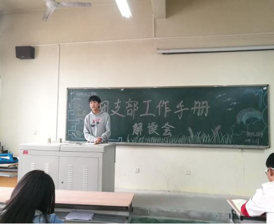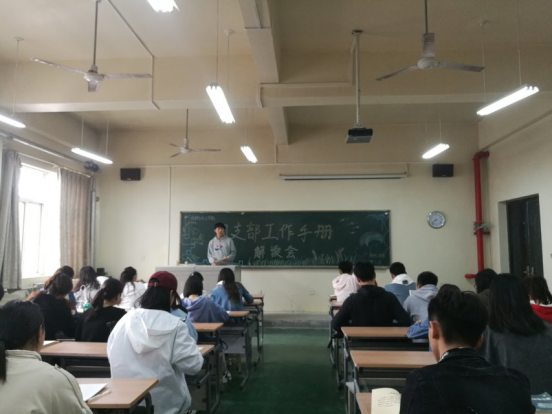 团支部工作手册解读会。学院团委副书记魏啸凯、院学生组织团委副书记刘锐、院团委秘书长苟以及16至18级全体团支书出席此次会议。