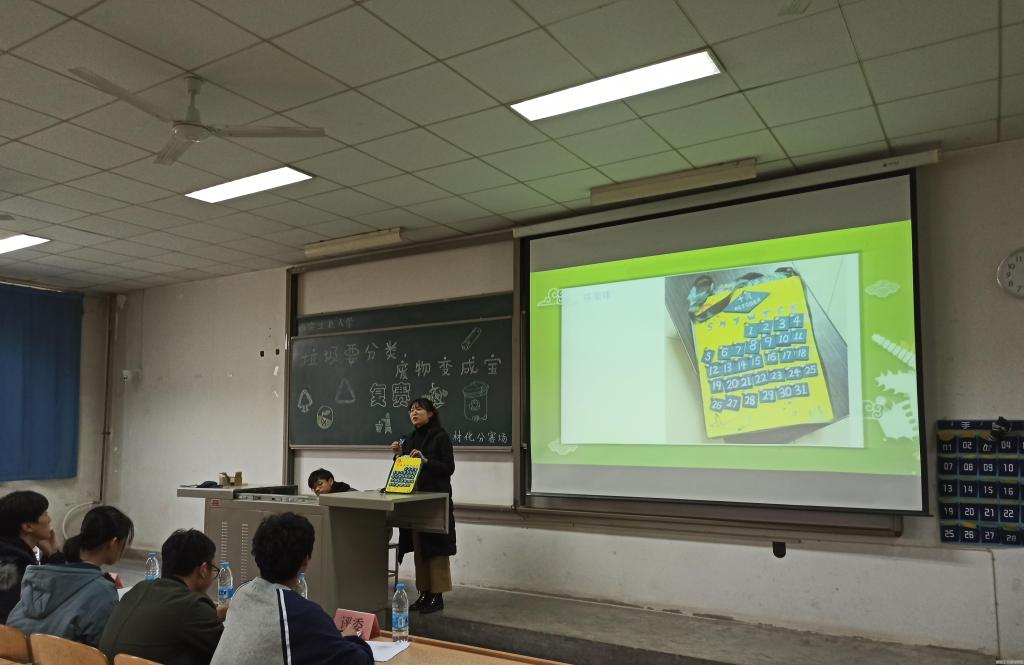 团委吴若愚和史林烨的主持下正式开始。首先由主持人介绍本次活动的宗旨即“垃圾分类,变废为宝”,紧接着进入比赛第一环节“变废为宝创意赛”,在机电工程学院青协副书记周迪迪宣读比赛规则后,参赛选手依次有序上台讲解自己团队的成果,每位选手的作品都极具创意,包含着积极向上的价值与意义。随后比赛到达第二环节“垃圾分类小达人”,由同人小说