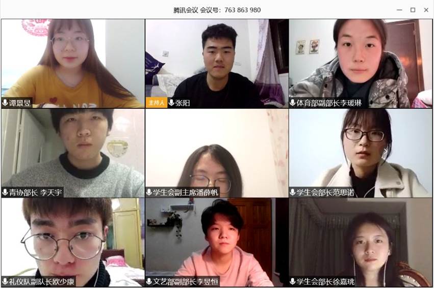 学生会于2020年3月6日晚8时通过网上视频的形式召开有关新学期工作安排部署会议。本次会议由学生会主席张阳主持,学生会全体干部参加本次会议。