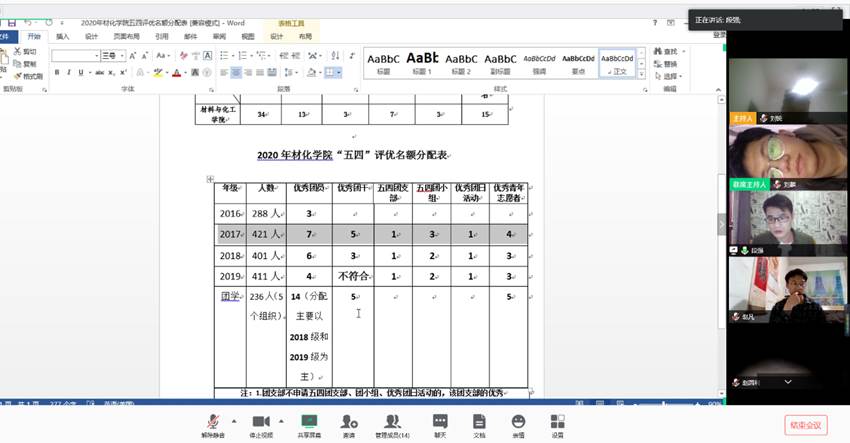 首先,段老师结合学校的文件表彰内容给大家做了详细的分类说明,并提出了每个奖项的个人和集体要求和申请条件,引导班干部要注重优秀青年学生和干部等方面的挖掘。其次,段老师也强调关于志愿者方面与往年的不同,针对疫情期间做出突出贡献的青年志愿者,一定要深入挖掘出来,根据团支部的民主评议,进行个人奖项的申报等等。针对此次五四评优工作,段老师也讲解可能出现的问题,以及相应的解决方法,通过文件的解读及安排,学生干部更加明确本次评优工作的重心及意义。最后,段老师就学生干部在疫情期间对班级的管理方面提出要求:及时了解班级学生的位置动态、每天掌握学生的线上学习情况以及班级在大三阶段常出现的问题等等。