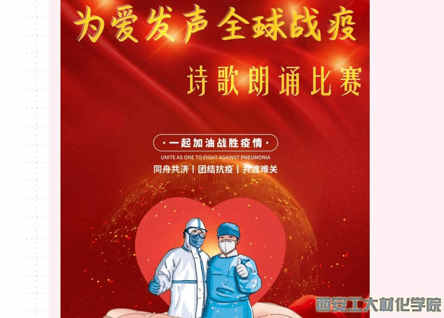 学生会于2020年4月22日-4月30日特举办“为爱发声,战疫全球”诗歌朗诵比赛,深化同学们的爱国之心,提升民族自豪感。