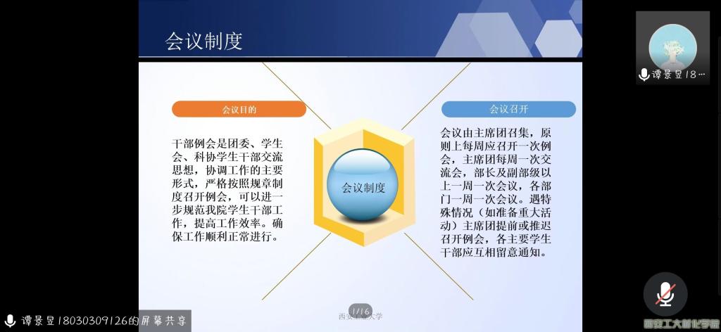 团委于2020年8月14日晚8时召开了活动策划、流程及制度规章等办公技能培训会议。本次会议由学生会干部潘薛帆主持,全体团学干部参加本次会议。