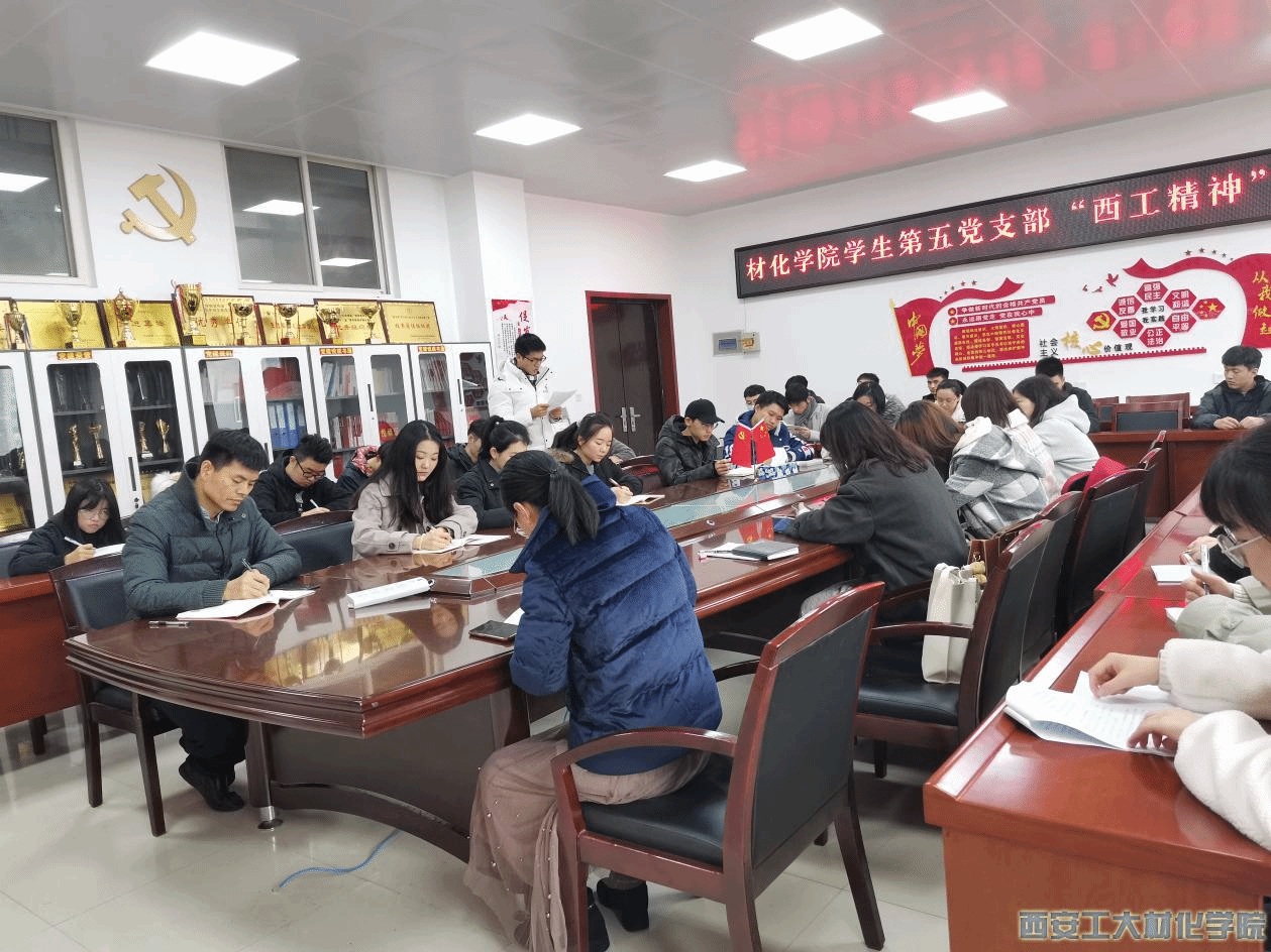 材化学院学生第五党支部于12月1日在工三-410组织召开“西工精神”专题学习会议。出席本次会议的有学院党委委员刘增超同志、支部书记乔娜同志和全体党支部成员,会议由乔娜同志主持。