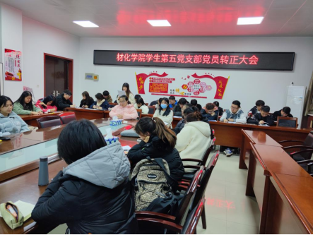 学生第五党支部于工三-410召开预备党员转正会议。党支部书记乔娜、支部正式党员、预备党员等35名同志出席会议,本次会议由支部副书记吕雪敏同志主持。