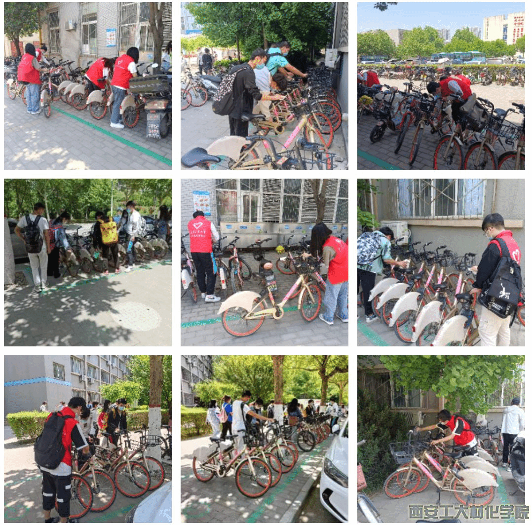 活动开始前,工作人员在校图书馆东侧集中组织志愿者有序签到,并安排本次活动的分工。活动过程中,志愿者对学校图书馆楼下,宿舍、食堂及校内道路上的共享单车进行了整理。大家积极主动,分工明确,用抹布擦拭单车上的泥土;将单车篮子里的垃圾放进垃圾袋里;将乱停放的共享单车扶正,统一摆放在共享单车推荐停车点。经过志愿者们的共同努力,校内共享单车陆续回归原位,一排排的整洁干净的单车成为校园一道亮丽的风景线。志愿者们通过此次共享单车清洁整理活动带头美化校园,积极宣传文明骑行、有序停放,劝阻、制止破坏共享单车的不良行为,提醒大家爱护公共设施,养成规范用车的好习惯。