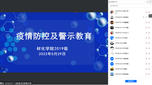 当前,疫情防控形势依然复杂严峻,为进一步提高青年学生的疫情防控意识,助力校园疫情防控工作,2022年5月29日中午,材化学院2019级围绕“疫情防控工作暨警示教育”为主题召开线上年级大会和线下学生干部会议,会议由材化学院2019级学生辅导员乔娜主持。