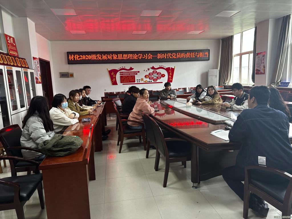 2020级于工3-410会议室开展以“动。2020级辅导员、学生第三党支部书记段强新时代大学生党员的职责与使命”为主题的思想理论学习活主讲,支部副书记薛清泽全体发展对象参加学习。