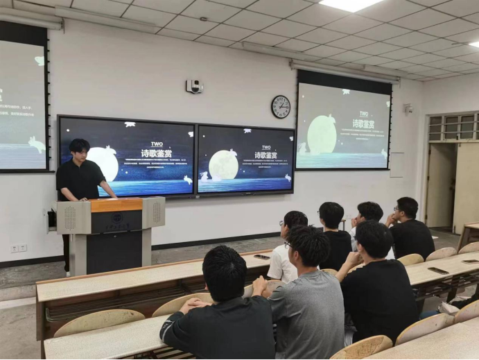 首先由班长通过互动问答的方式为大家介绍了中秋节的由来与历史渊源,接下来是“诗歌鉴赏”环节,苏轼的《水调歌头 明月几时有》上阙望月,下阙怀人,词人由中秋的圆月联想到人间的离别,抒发了词人对人生的聚散离合的感慨,同时也表达了词人旷达的人生态度和乐观的精神;张九龄的《望月怀古》诗歌意境雄浑阔大,骨力刚健,但又情感真挚,特别是前两句早已成为千古名句;李白的《静夜思》全诗白描,实物只有床、月光、山月,虚拟的还有霜和故乡,虚实结合,以实写虚;动作也只有看、望、举头、低头、思,包含近(看)远(望)、高(举头)低(头),最后突出思故乡的主题,通俗明白,紧扣题目;《望庐山瀑布》这首诗形象地描绘了庐山瀑布雄奇壮丽的景色,反映了诗人对祖国大好河山的无限热爱,通过这几首经典诗词表达了中秋的主题与思乡之情,最后一个环节是猜灯谜,通过几个有趣的灯谜将同学们的热情彻底调动起来,本次活动也在同学们的欢声笑语中完美落幕。