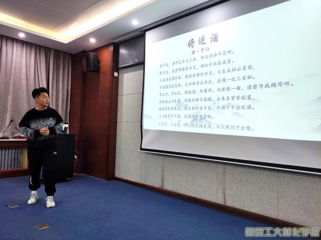接下来,由五位同学分别诵读了《活着》、《水调歌头》、《青春》、《归园田居》和《将进酒》中的经典名篇,展示了中华诗词的魅力。他们分析了诗词中的意境、情感、风格,并发表自己对诗词的理解,畅谈通过诵读后的感受和启示。