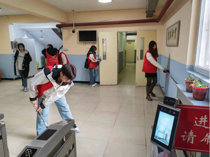 活动开始,支部党员统一服装,分为4个小组前往学校的7、8、9、10公寓,并与宿管阿姨认真的交流平时工作内容和要求,按照工作安排重点对楼道里的字画框、饮水机、消防栓以及楼梯栏杆等进行仔细擦拭,并仔细排查宿舍楼层存在的安全隐患。志愿者们秉承“奉献、友爱、互助、进步”的志愿服务精神,积极工作,过程中不怕苦不怕累,将所负责的区域卫生打扫的干干净净净,并获得阿姨对活动成效的高度赞扬。活动结束购,学生党员闫菁谈到:身为一名学生党员,应发挥先锋模范作用,用实际行动践行党员的初心和使命,影响更多的学生加入到志愿服务活动中去,共同营造和维护宿舍区域的健康、安全、有序的学习生活环境。