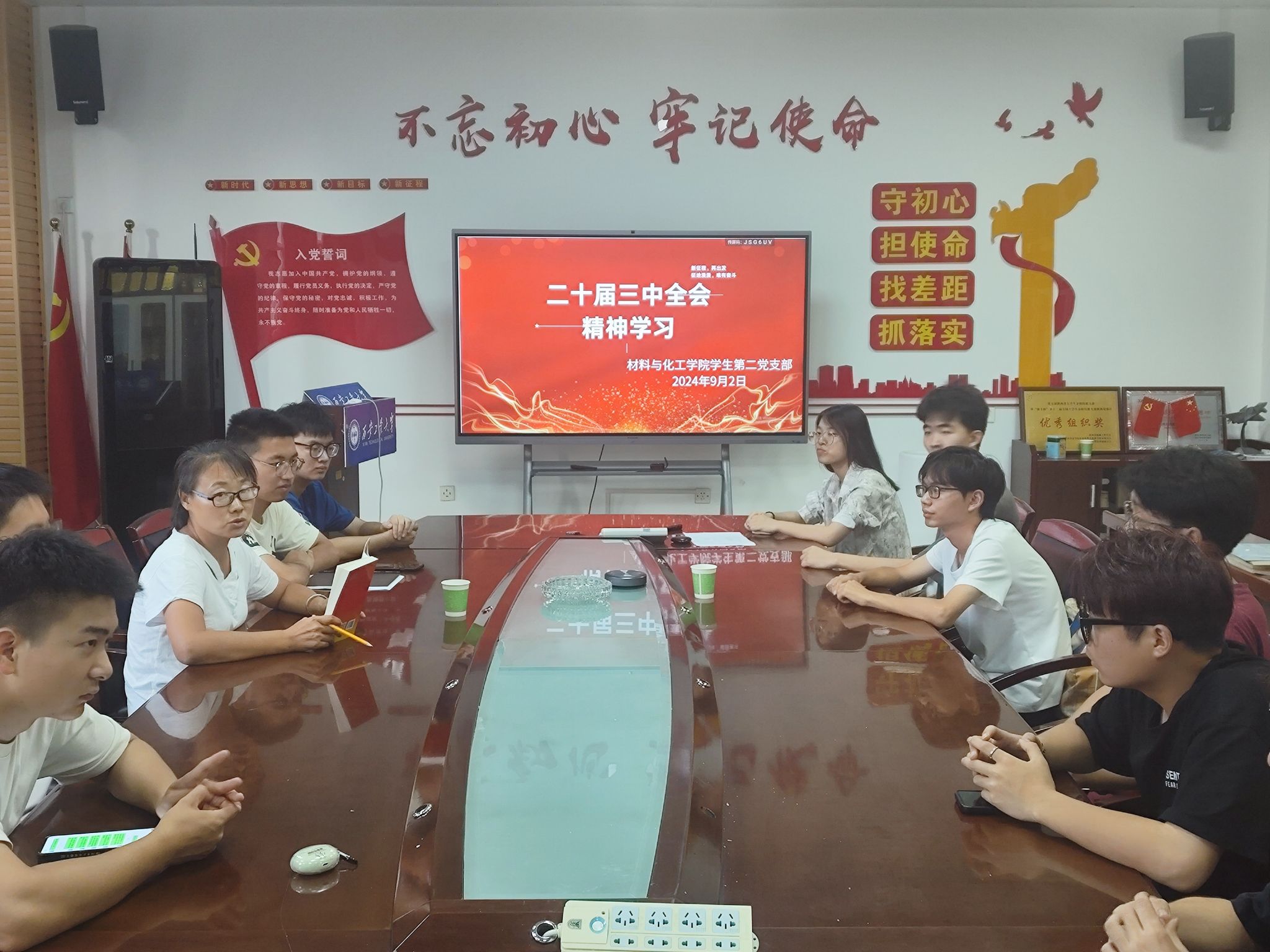 为深入学习贯彻党的二十届三中全会精神,帮助学生党员全面理解和准确把握全会精神内涵,2024年9月2日下午,材化学院学生第二党支部在工3-410召开党的二十届三中全会精神专题学习会。会议由支部书记张瑞红主持,全体党员参加了学习会。