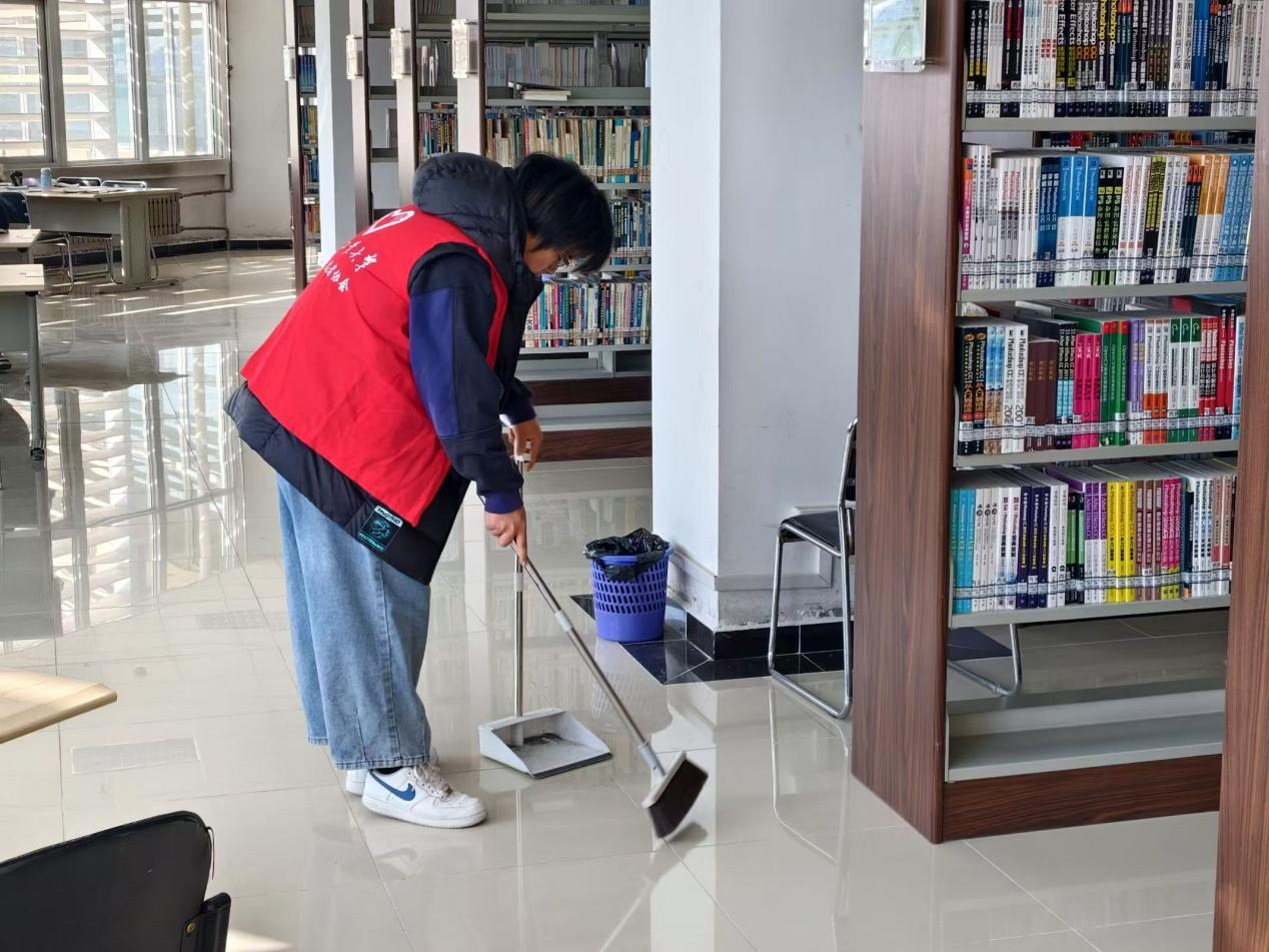 活动伊始,学生干部刘玉杰统计并安排了志愿者与学生干事们的工作时间表。学生干部按照工作值班表带领着志愿者进入图书馆,在图书馆工作人员的指引下对指定区域展开清洁工作。志愿者对书架、桌椅、地板进行了擦拭,清扫,拖洗等清洁工作。发扬不怕苦、不怕累的精神,彼此之间相互配合,默契十足,活动过程中也让志愿者们体会到劳动的辛苦与快乐,也体会到了热心为同学服务的荣誉感与自豪感,在四天的志愿服务中,图书馆整体环境焕然一新。值得一提的是,这4天恰逢考研日。为了给考研学子创造安静、整洁的复习环境,志愿者们在打扫过程中格外小心,尽量减少噪音干扰。志愿者们的默默付出,得到了众多考研学子的认可和好评,许多同学表示,在紧张的备考间隙,感受到了来自图书馆大家庭的温暖,更加坚定了考研的信心。