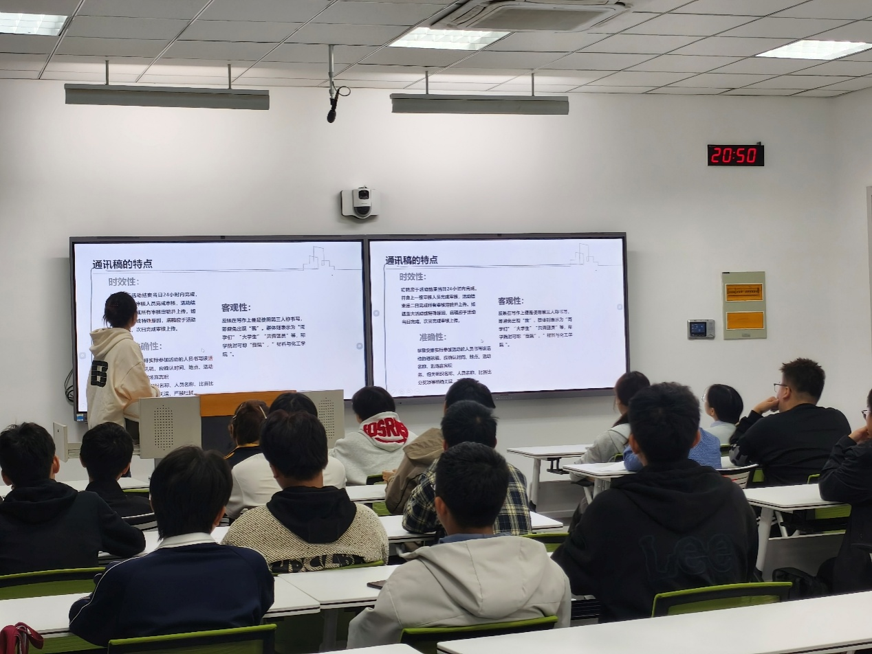 会议伊始,郑诗钰明确了本次例会“掌握通讯稿核心要点、提升实际写作能力”的学习目标,并围绕“认知-拆解-实操”逻辑展开培训。在“了解通讯稿”环节,她结合过往活动稿件案例,清晰阐释了通讯稿“真实性、时效性、客观性”的核心特点;进入“内容及格式”讲解时,她逐项拆解标题、导语、主体、结尾的写作规范,尤其强调导语需涵盖“时间、地点、人物、事件”四要素,主体部分要突出活动核心内容;最后在“注意事项”环节,她针对稿件中的常见问题,如语言口语化、逻辑层次不清等,给出具体修改建议,帮助成员规避写作误区。