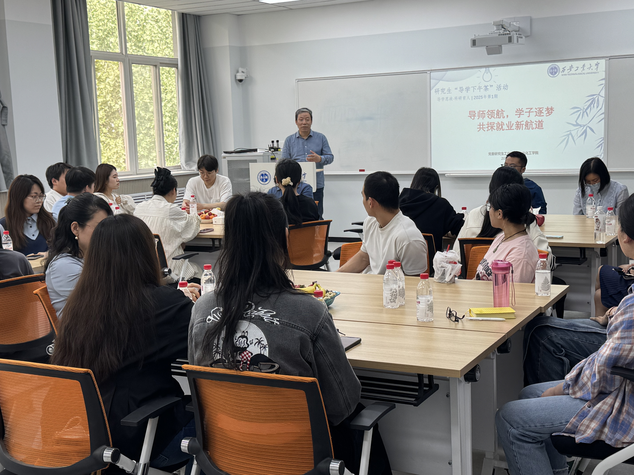 活动开始,辅导员胡娜老师介绍了此次活动的背景、活动主题、和目的。陈卫星书记向同学们介绍了目前就业情况和就业形势,分享了对就业方向选择的看法,鼓励同学们加强自身专业素质,做好自己的职业生涯规划。同时,他希望同学们在进入人生新阶段后,要将个人命运与国家发展紧密结合,坚持奋斗,不断进步。研究生导师代表白亚平教授进行了导师助力学生就业经验分享,提醒研究生同学要尽早制定职业规划,加强与导师之间的沟通,有针对性解决学业就业问题。