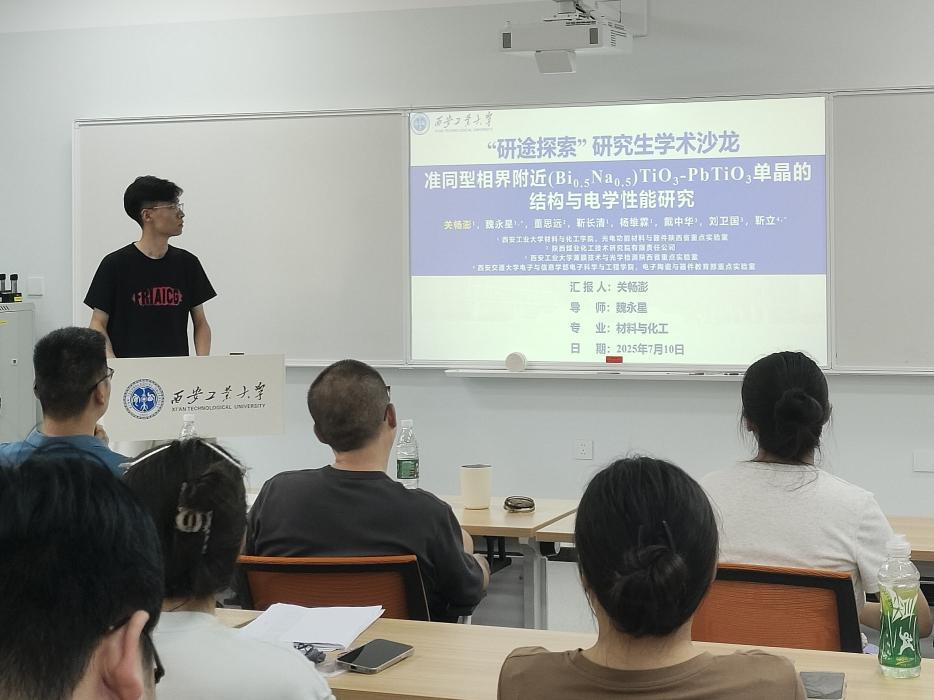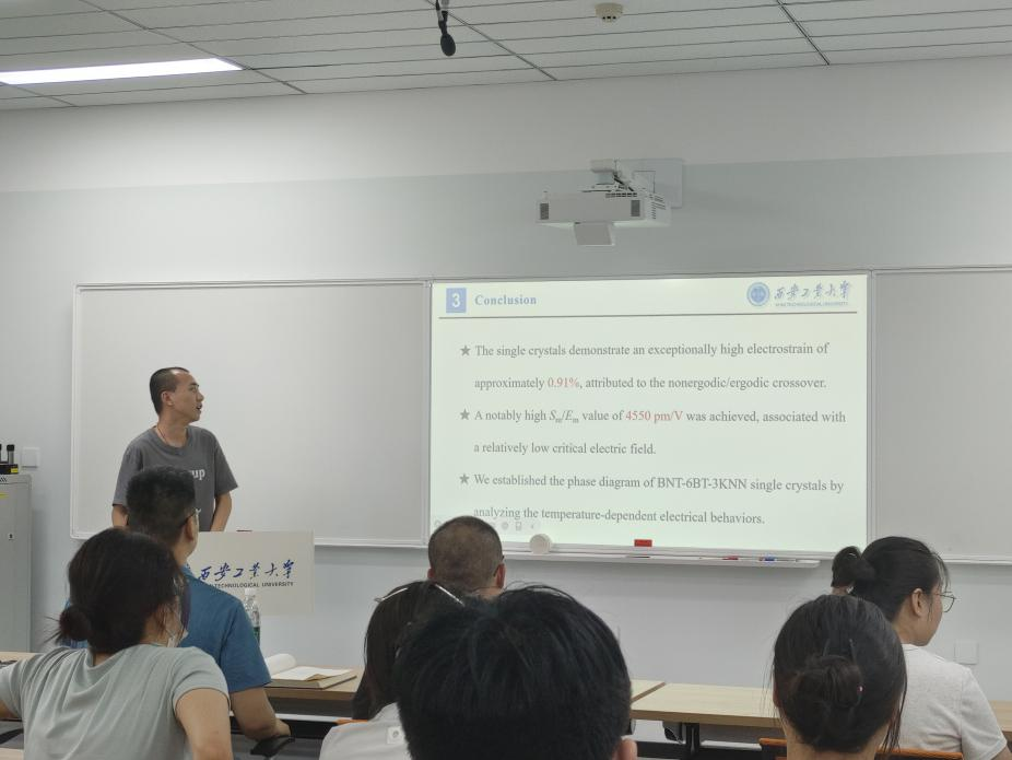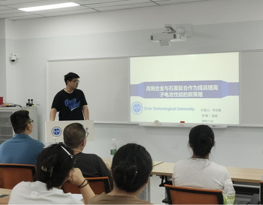 活动过程中,三位优秀研究生代表依次带来精彩的学术分享。2024级博士研究生牛佳林以“助熔剂法生长的钛酸铋钠基单晶的超高电致应变”为题,系统阐述了钛酸铋钠基单晶的制备工艺、性能优势及潜在应用场景,展现其在新型电子器件领域的研究价值;2023级硕士研究生关畅澎围绕“准同型相界附近Bi0.5Na0.5TiO3-PbTiO3单晶的结构与电学性能研究”,深入剖析相界行为对单晶电学性能的影响机制及优化路径,为智能传感器材料开发提供创新思路;2024级硕士研究生李庆根以“高熵合金与石墨复合作为提高锂离子电池性能的新策略”为主题,介绍复合材料的制备方法、性能测试结果及在储能领域的应用前景,引发在场同学的广泛关注与热烈讨论。